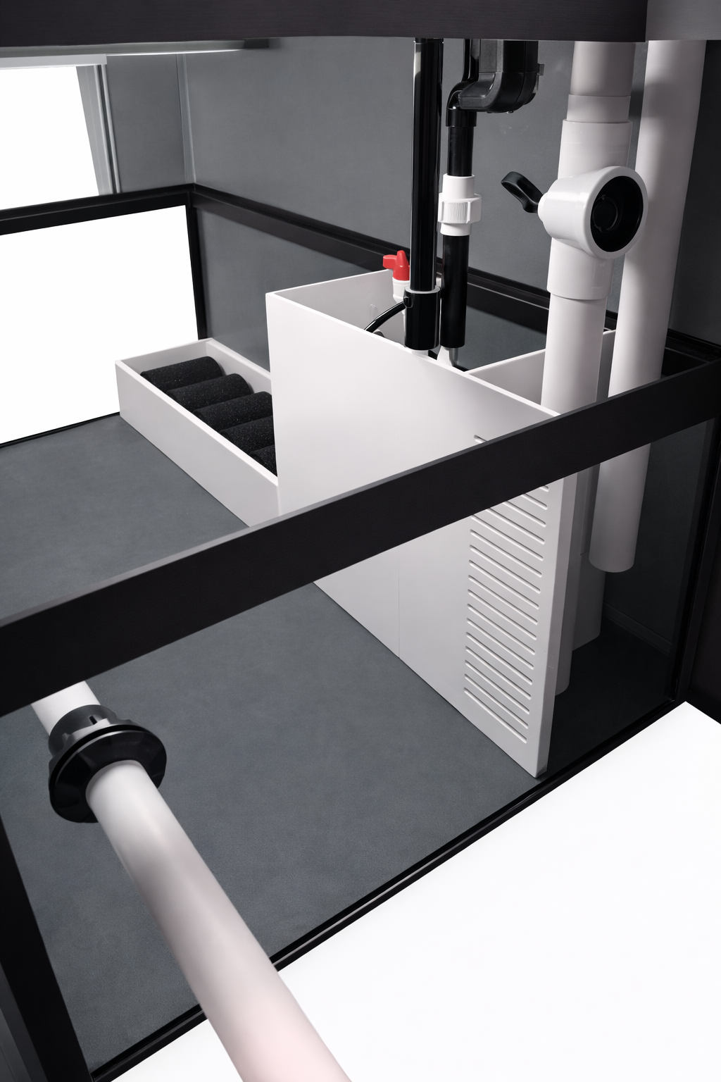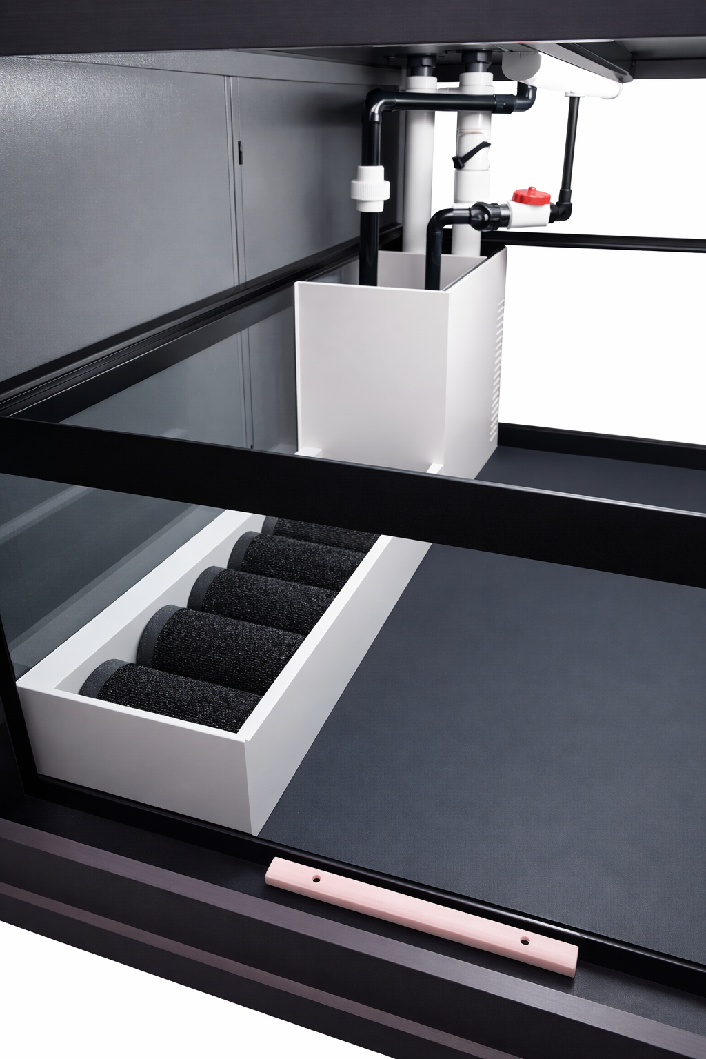 Integrated biological filtration system housed in the stand with dual-layer foam bio-spools and media trays for superior water quality.