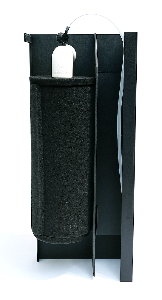 Water flows from right to left through the bottom rear wall of each tank. A foam pre-filter is in place to prevent smaller fish from moving between the tanks.